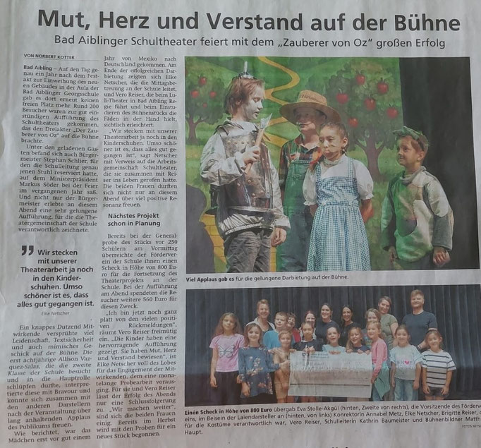 In der St Georg Schule fand am Donnerstag 10.7.25 die Kinder-Aufführung vom Zauberer von Oz statt. In Kooperation mit dem Kreisjugendring Rosenheim betreut das Theater Aibling e.V. dort seit Anfang des Schuljahres eine Theater AG unter der Leitung von Vero Reiser.